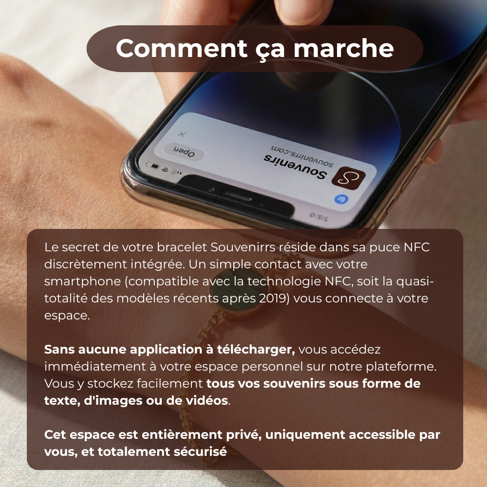 Le véritable trésor réside à l'intérieur : une puce NFC invisiblement intégrée. Elle vous permet d'enregistrer vos souvenirs les plus précieux (un message d'amour, une photo chérie ou une chanson qui vous donne de la force). D'un simple contact avec votre smartphone, votre histoire redevient accessible sur notre plateforme.