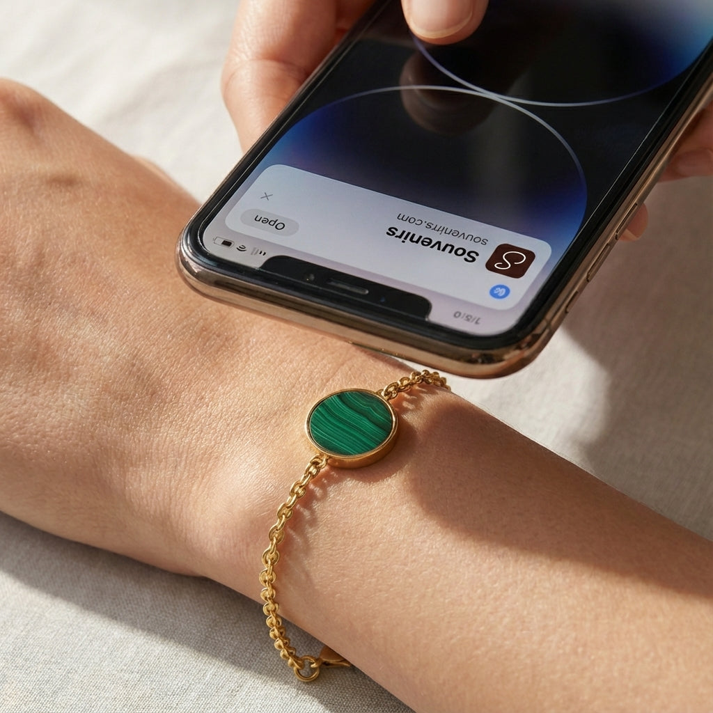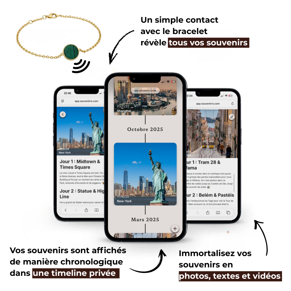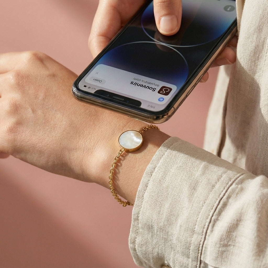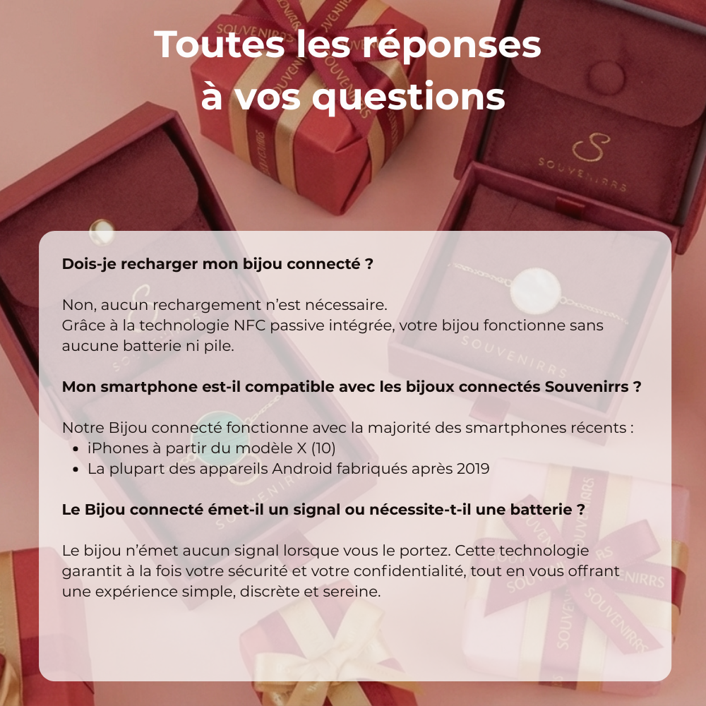 Un simple contact avec votre smartphone suffit : la Plateforme Souvenirrs révèle la magie, donnant instantanément vie à votre bijou et à vos plus beaux souvenirs